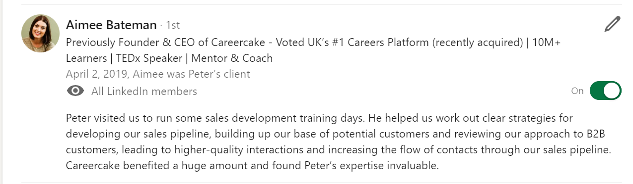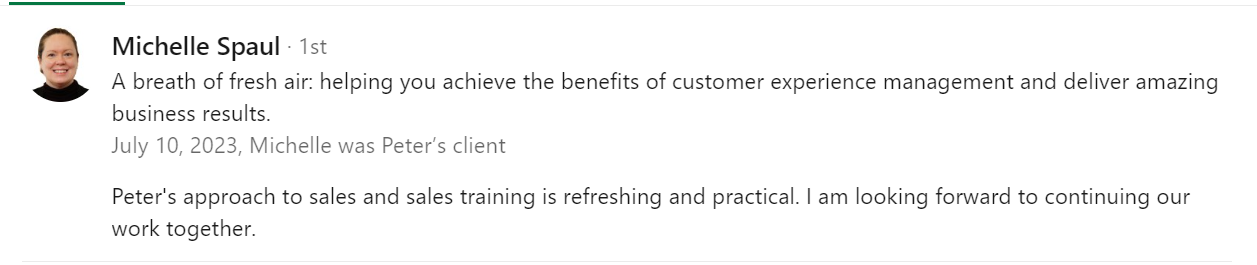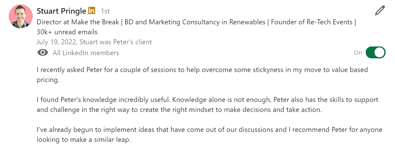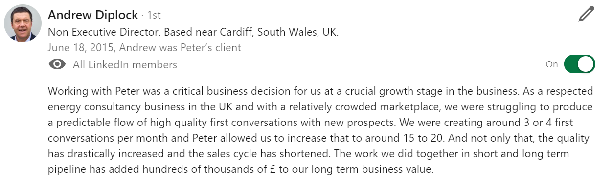 "Working with Peter was a critical business decision for us at a crucial growth stage in the business. As a respected energy consultancy business in the UK and with a relatively crowded marketplace, we were struggling to produce a predictable flow of high quality first conversations with new prospects. We were creating around 3 or 4 first conversations per month and Peter allowed us to increase that to around 15 to 20. And not only that, the quality has drastically increased and the sales cycle has shortened. The work we did together in short and long term pipeline has added hundreds of thousands of £ to our long term business value'"