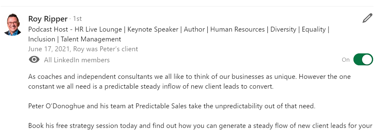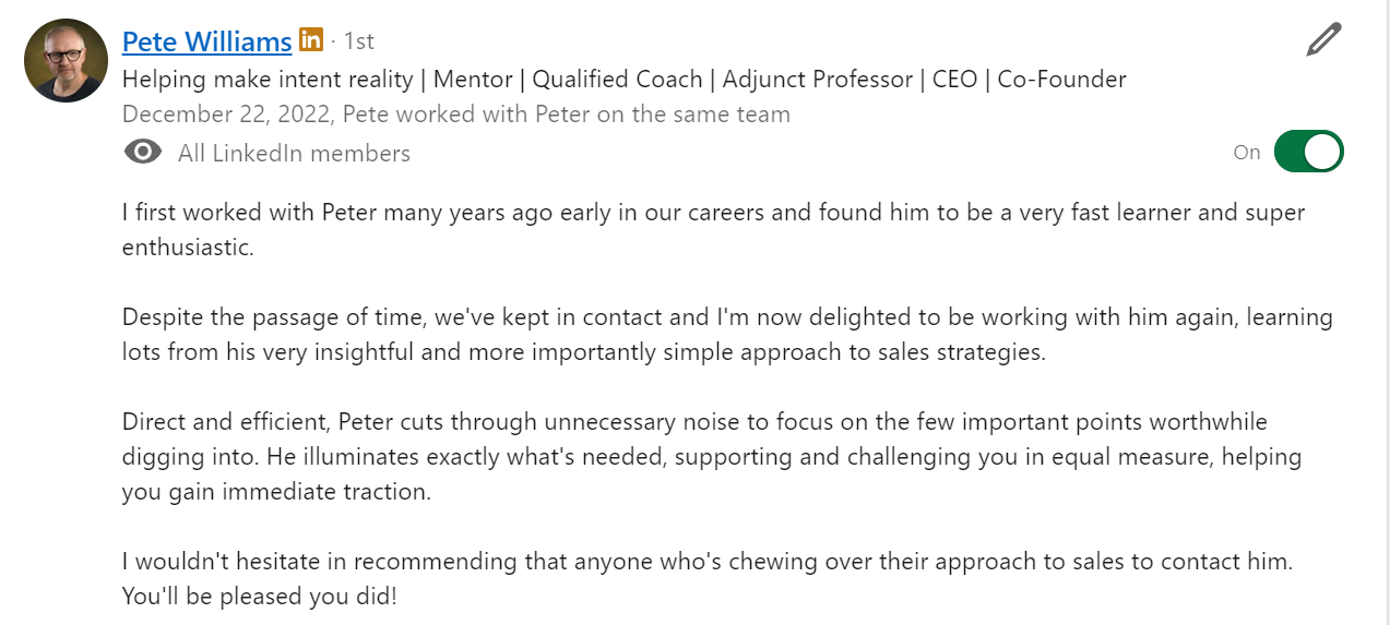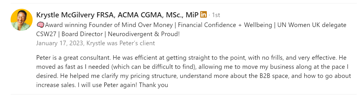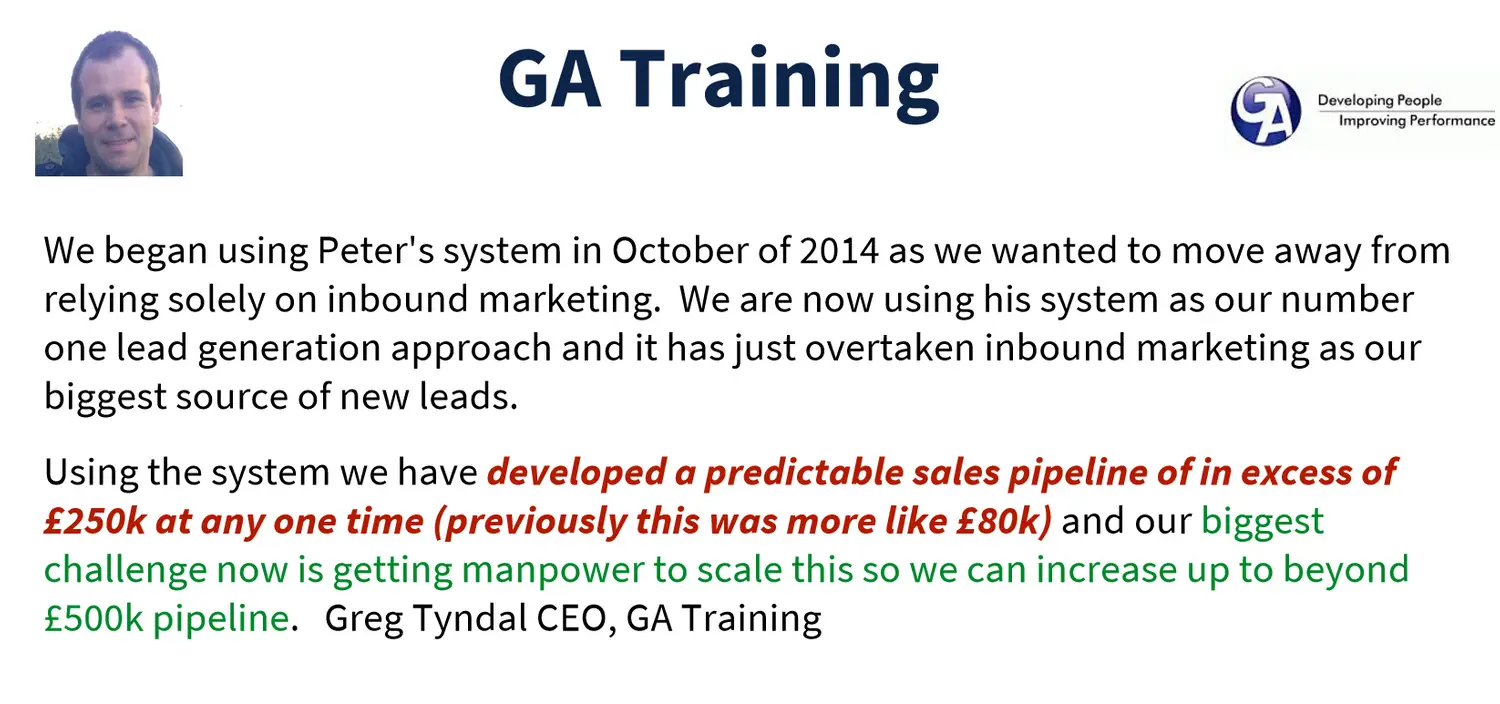 "I generated over £170,000 of booked revenue within 2 months. I learned so much about my potential clients that arrogantly I figured I already knew. I learned a lot about where they were going, rather than dragging them to what I was offering. The third thing, and this is probably the most important in terms of the rubber hitting the road, getting the confidence and starting to book some revenue, is being able to take those first two parts, understand your network, understand your client insight, then have an offer for them which meets their needs, that is really, really simple."