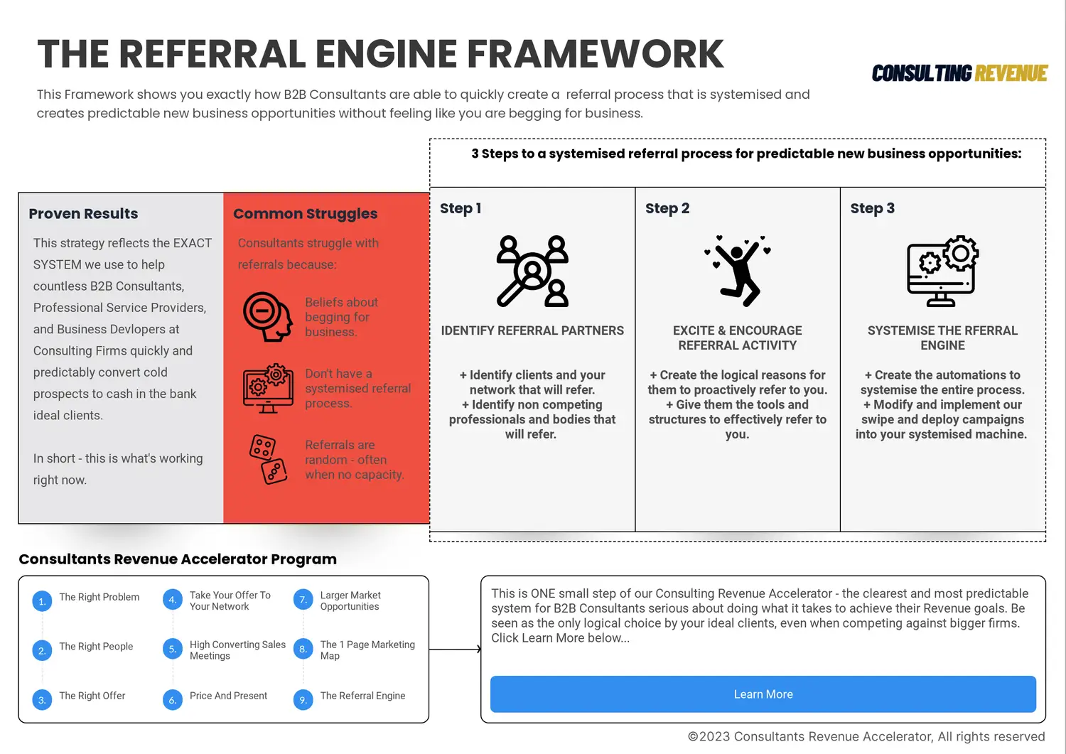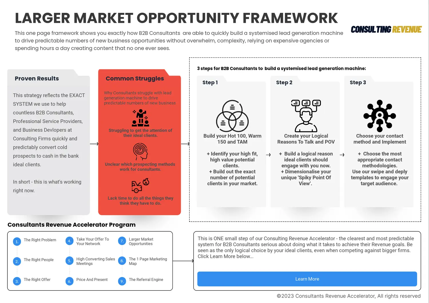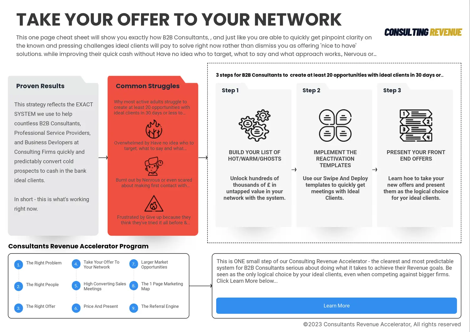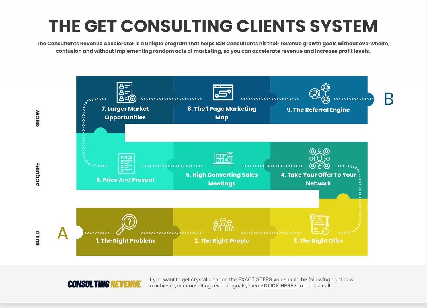 The main 'Get Consulting Clients' System is an A to B stepped framework comprising of 9 distinct and interlinked frameworks. They are all designed to get you working on the least amount of things possible to get you the maximum results without overwhelm or confusion.