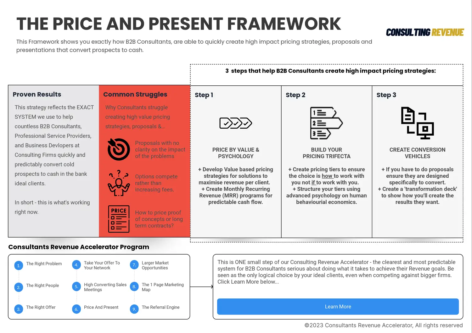 Price and Present is the strategic blueprint you need to stop leaving your success to chance. This module will show you exactly how to create high-impact pricing strategies, compelling proposals, and irresistible presentations that don’t just close deals—they position you as the premium consultant your clients can’t wait to pay.